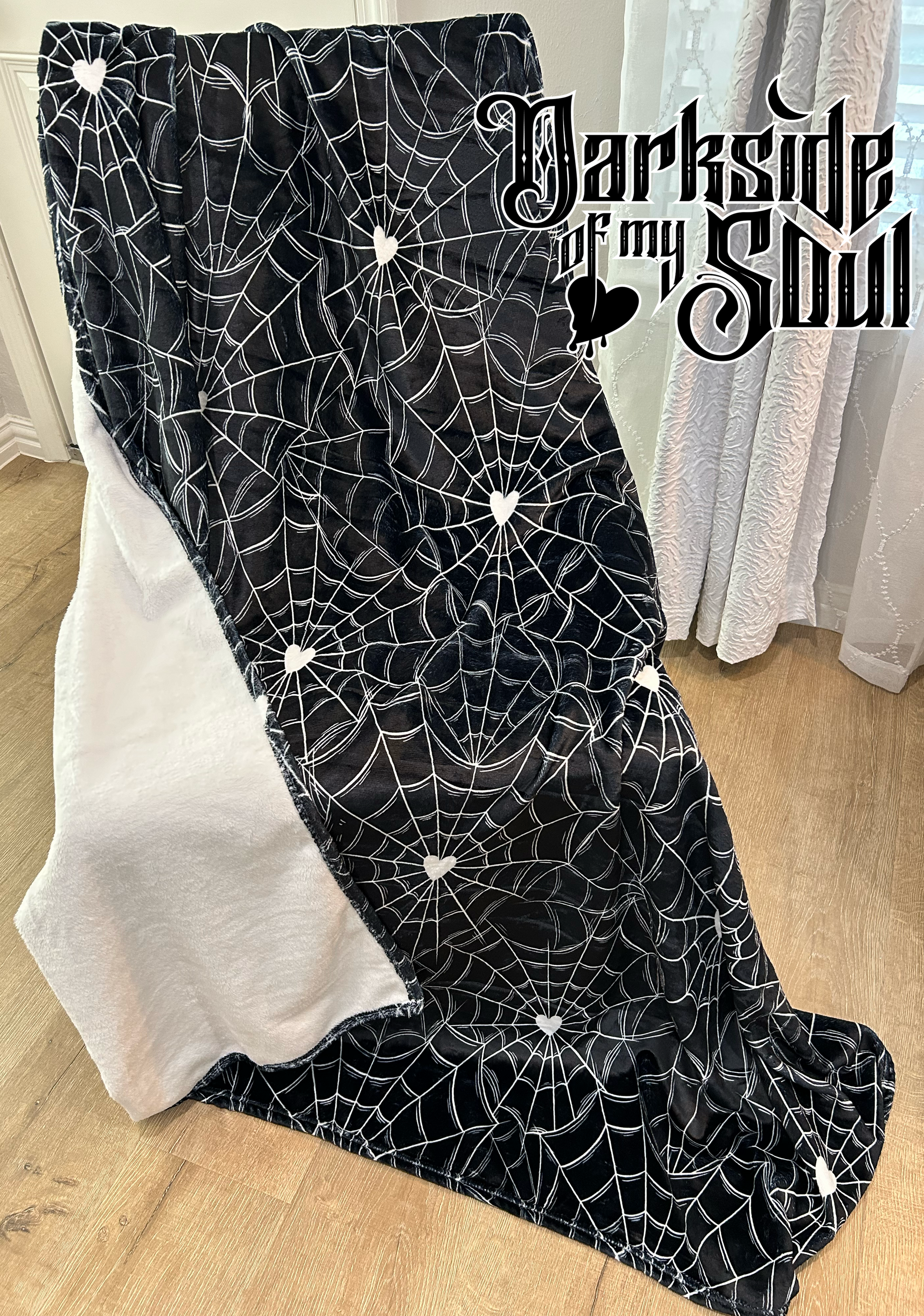 Snuggle up and watch your favorite movie with this spooky cute heart web blanket. Super soft and warm...perfect for that special someone in your life or for yourself.