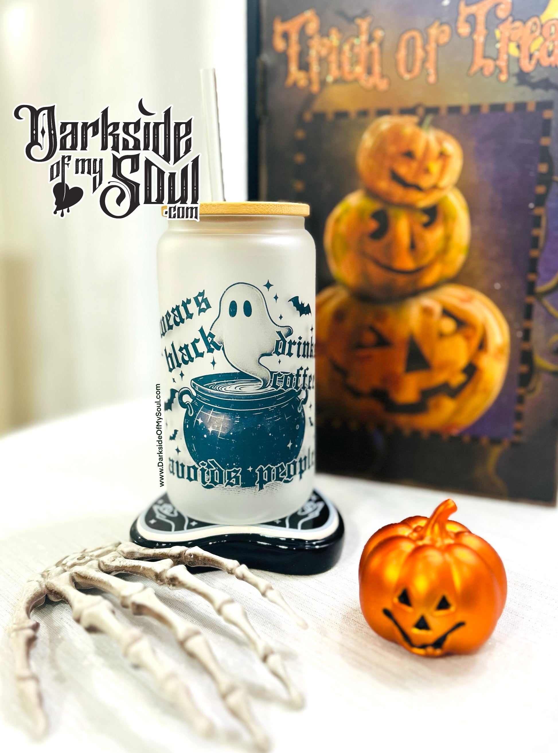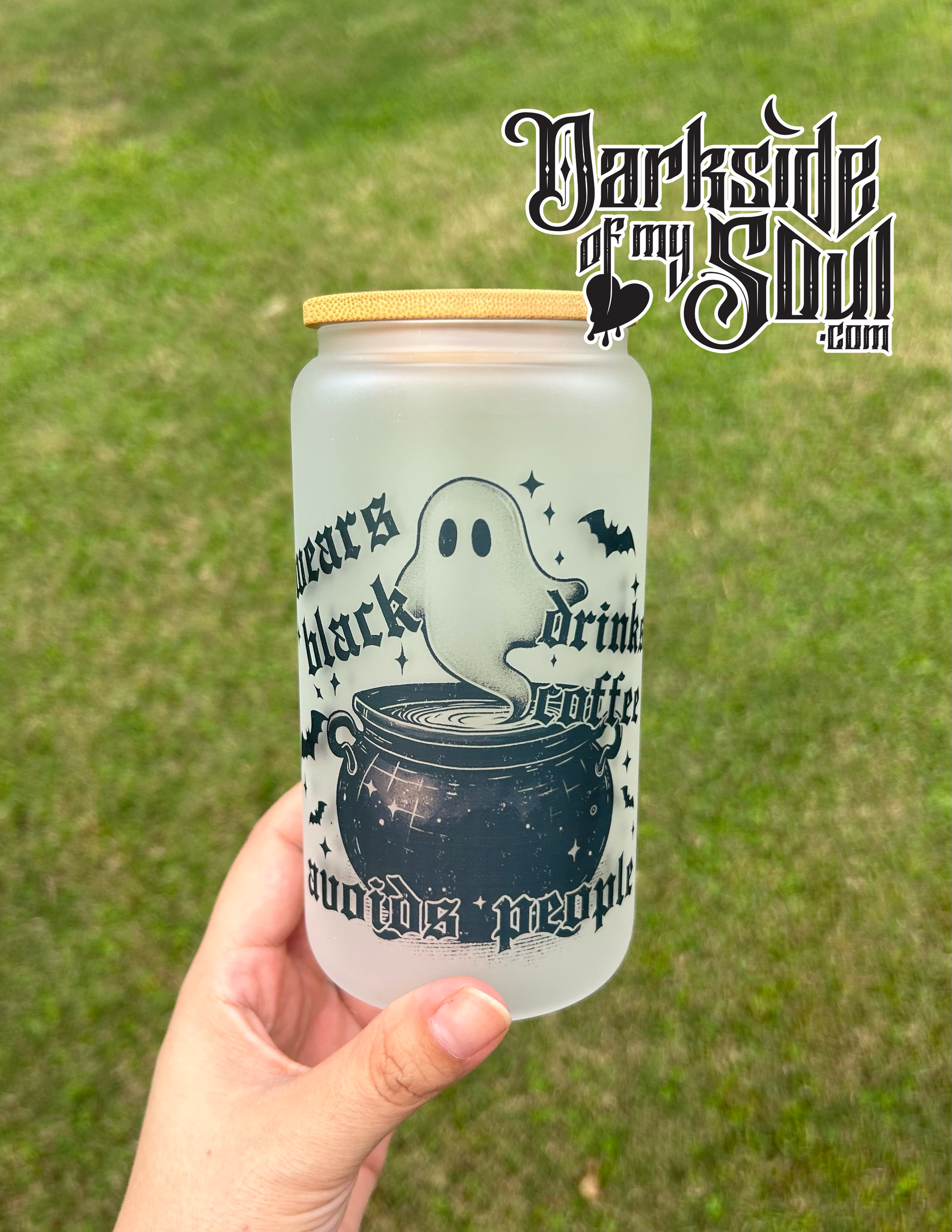 Wears Black Drinks Coffee Avoids People | 16oz. Frosted Glass Cup